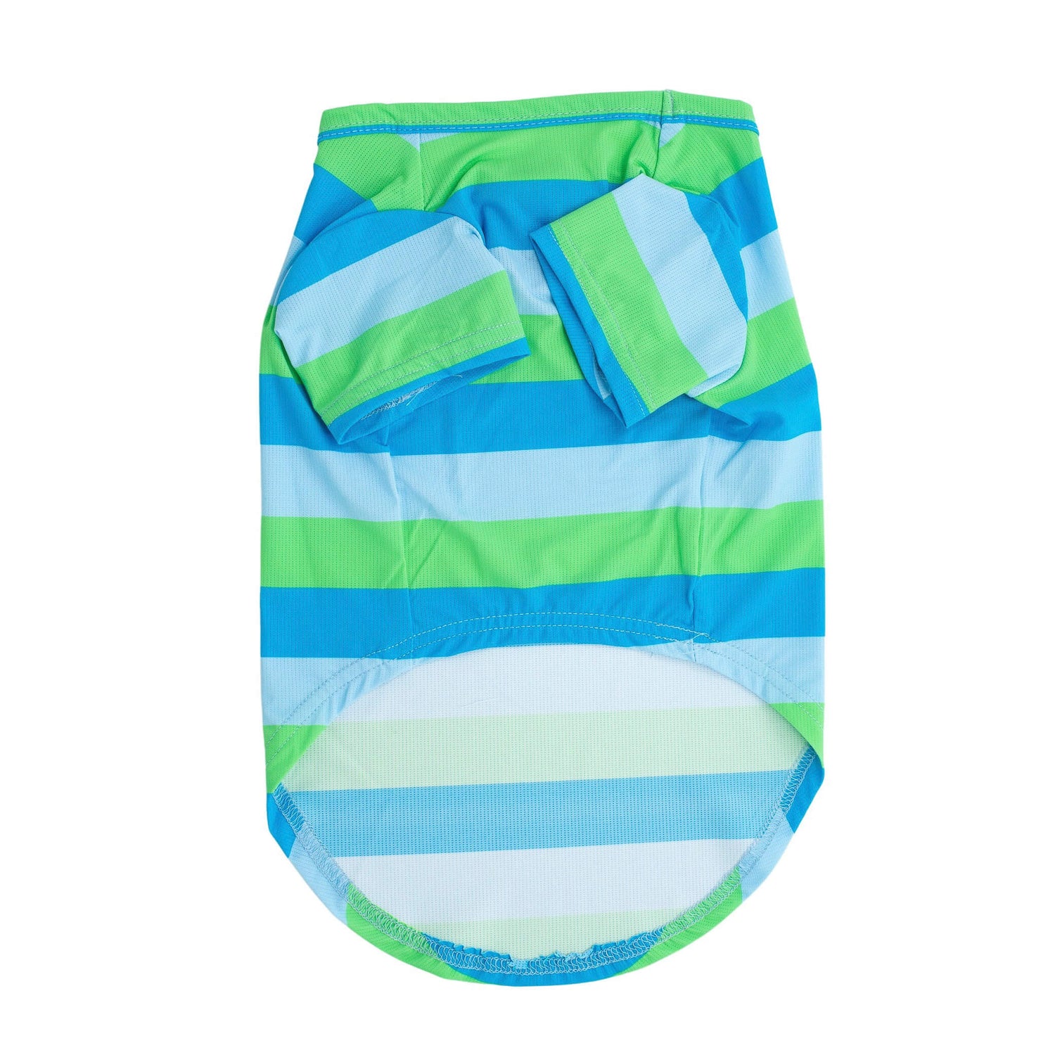 This dog shirt is designed to keep your pup cool this summer. This shirt is designed to hold water and has a breathable mesh skin that helps to conduce evaporation.